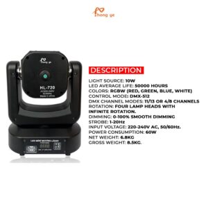 HL 720 stage light is a premium-grade RGBW LED fixture engineered to deliver exceptional lighting performance for modern stage productions, concerts, theaters, and live events. Built to satisfy the demands of professional lighting designers, event technicians, and touring productions, the HL 720 combines powerful output, smooth motion, and advanced control features in one compact and durable unit. With its four 10W RGBW 4-in-1 LED lamps, this fixture offers intense brightness, rich colors, and outstanding beam quality suitable for everything from subtle ambient moods to high-impact visual effects.